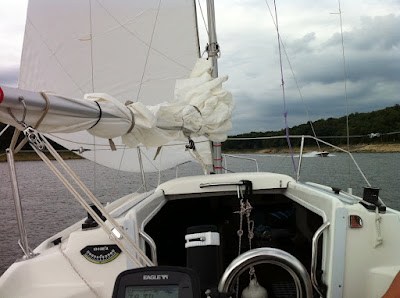 Murphy's law, it began raining about the time I started putting the boots onto the sails. By the time I had the boom removed, thunder was loud and lighting was visible. We lowered the mast in the downpour and I secured as much of the shrouds and rigging as possible.